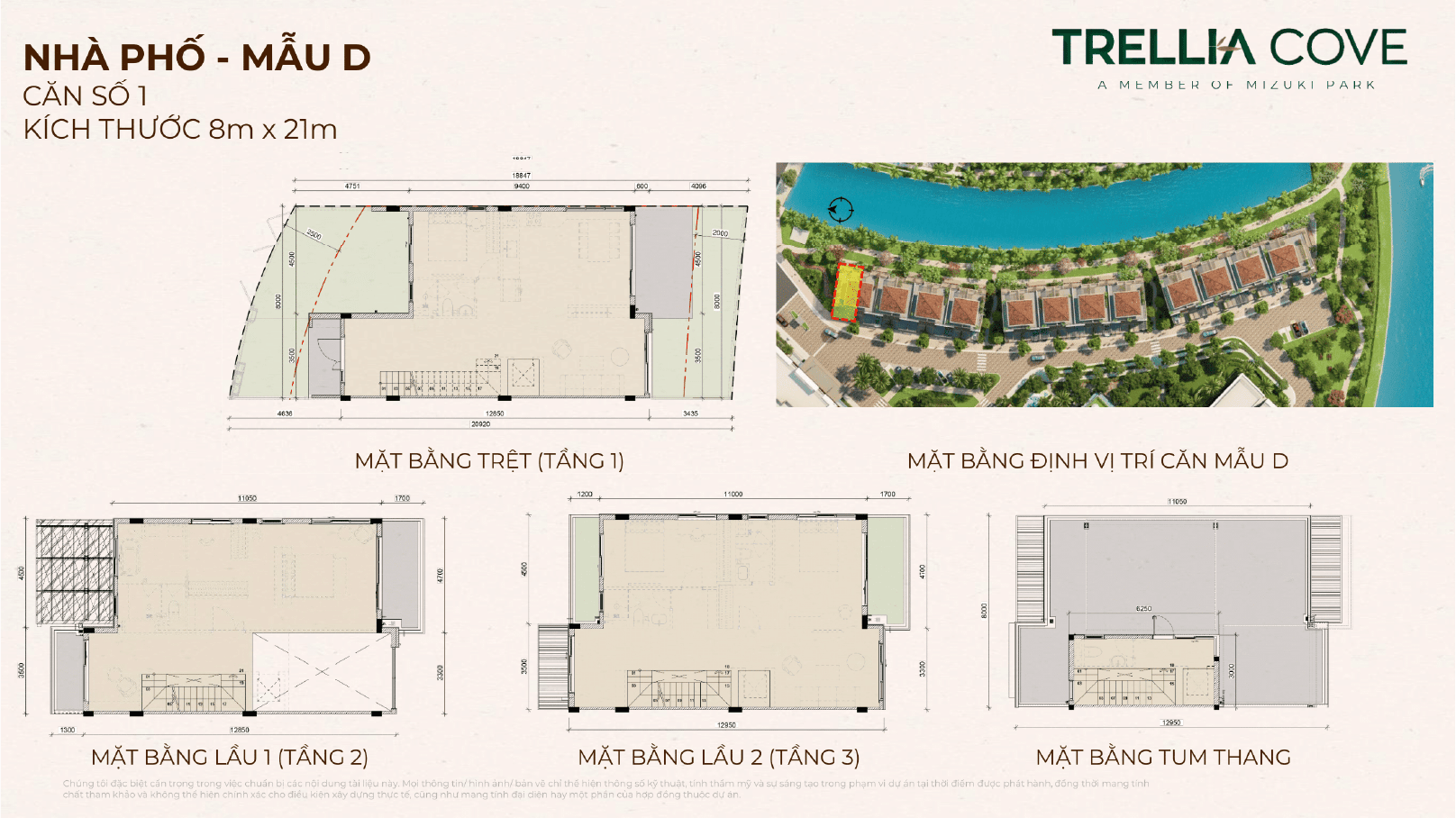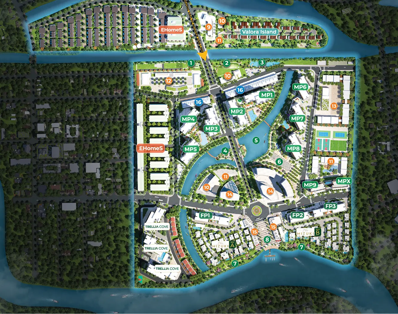 Trellia Cove tọa lạc tại vị trí đắt giá ở cuối trục chính Mizuki Park: một mặt ôm trọn kênh đào trung tâm - cảnh quan đặc trưng của khu đô thị, một mặt hướng ra rạch Bà Lào – dòng thủy sinh tự nhiên hiền hòa. Địa thế tựa “ốc đảo” riêng tư, mở ra tầm nhìn 360° khoáng đạt giữa thiên nhiên xanh mát.